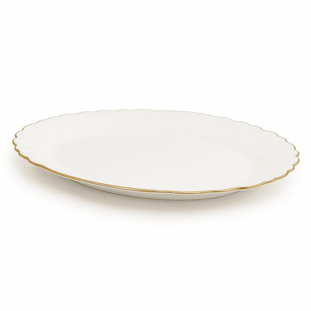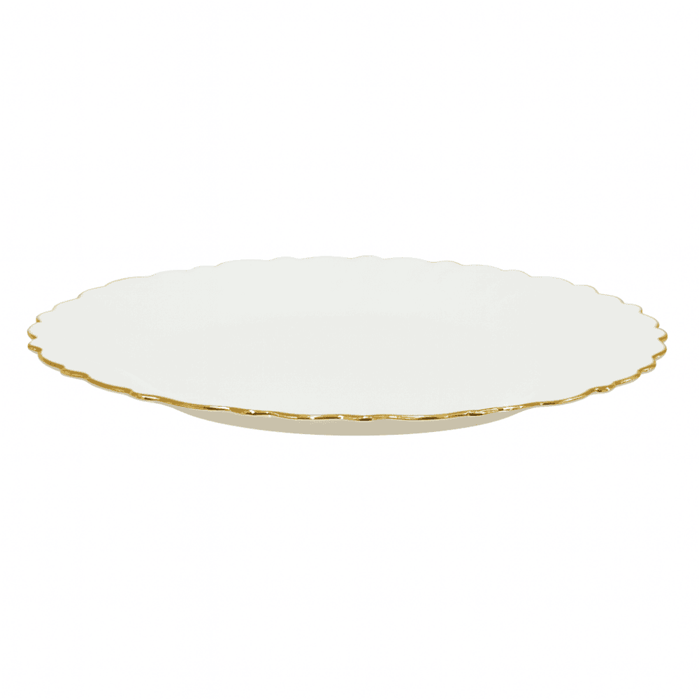 Designul rotund clasic este evidențiat de conturul în valuri, care oferă un aspect unic și elegant. Bordura aurie adaugă o notă premium, transformând farfuriile în piese de decor în sine, ideale pentru servirea felurilor principale, salatelor, pastelor sau preparatelor elegante.