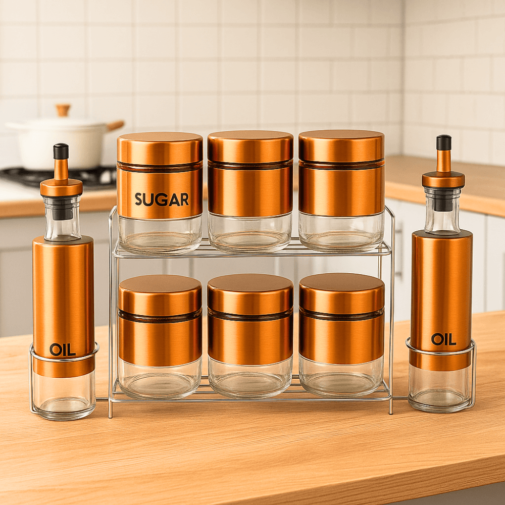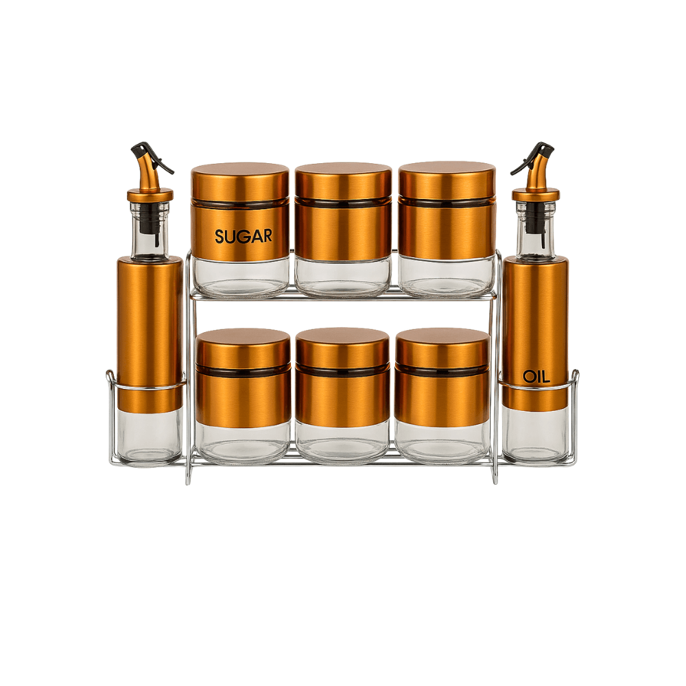 Setul de recipiente pentru condimente și ingrediente esențiale aduce eleganță și organizare în orice bucătărie. Format din 9 piese, acesta include 6 borcane din sticlă groasă cu capace metalice aurii, 2 sticle cu dozator pentru ulei sau oțet și un suport metalic cromat pentru o așezare ordonată.