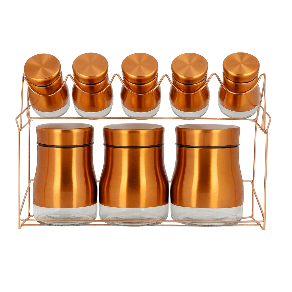 Adaugă eleganță și funcționalitate în bucătăria ta cu setul de recipiente pentru condimente din sticlă și inox, culoare cupru. Format din 9 piese, setul include 5 recipiente mici pentru condimente și 3 borcane mai mari pentru cafea, ceai sau zahăr, toate prevăzute cu capace etanșe pentru a păstra prospețimea și aroma ingredientelor.