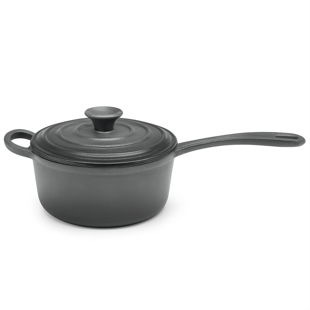 Interiorul emailat este rezistent, igienic si nu retine mirosuri, iar suprafata neteda previne lipirea alimentelor si permite o curatare usoara. Coada lunga din fonta asigura o manevrare sigura, iar manerul lateral ofera stabilitate suplimentara.