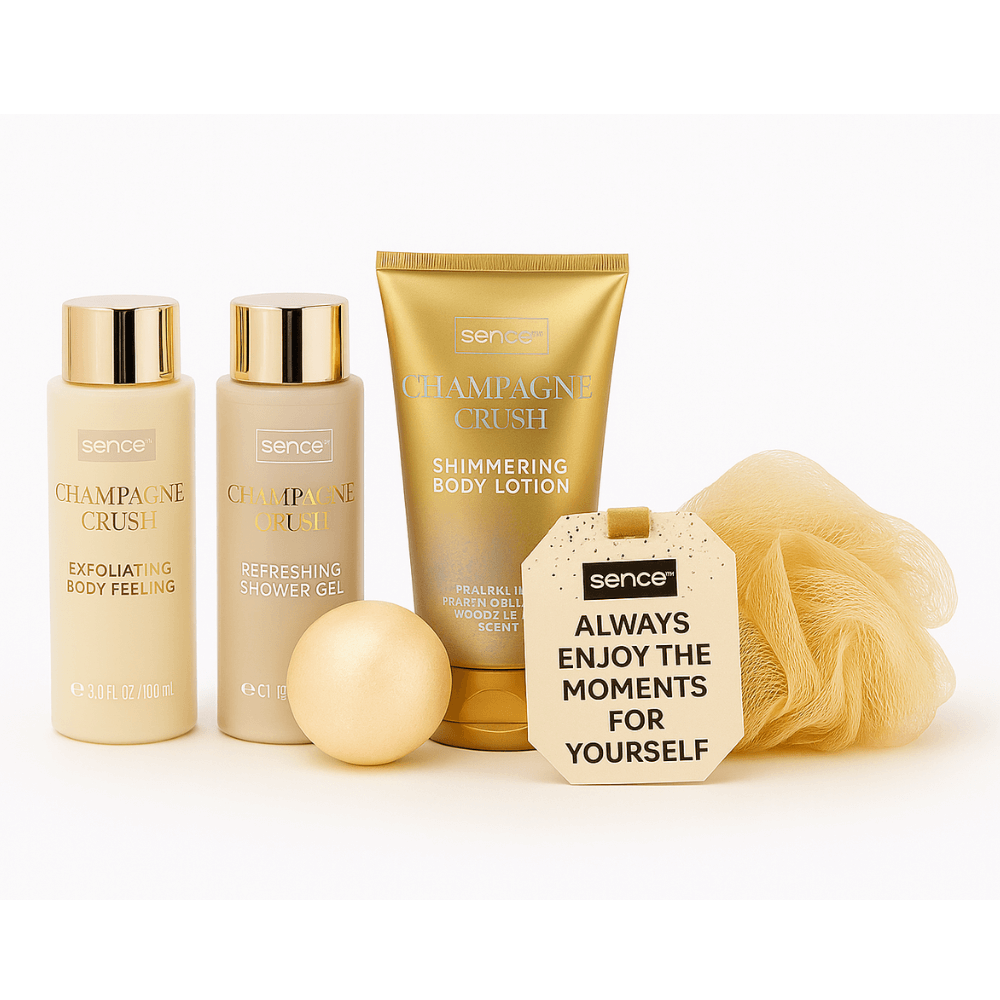 Răsfață-te cu eleganță și rafinament cu setul Sence Champagne Crush, un cadou perfect pentru relaxare și momente de răsfăț. Ambalat spectaculos într-un suport în formă de pantof auriu, acest set oferă o experiență completă de îngrijire corporală cu un parfum subtil și luxuriant.