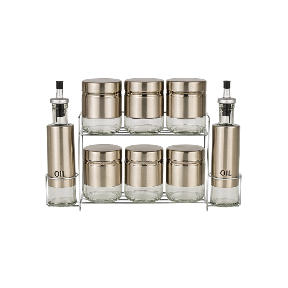 Setul de recipiente pentru condimente și ingrediente esențiale este alegerea ideală pentru o bucătărie modernă și organizată. Format din 9 piese, acesta conține 6 borcane din sticlă groasă cu înveliș metalic din inox satinat, 2 sticle cu dozator pentru ulei sau oțet și un suport metalic cromat, care asigură stabilitate și economie de spațiu pe blatul de lucru.